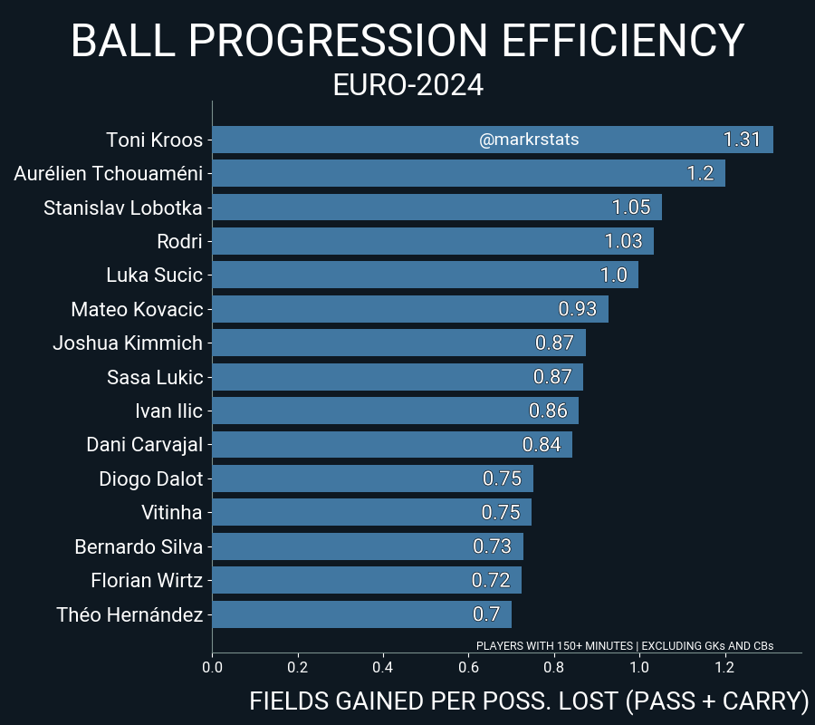 De hecho, se salió de tal forma en la Euro que según las estadísticas solo Kroos estaba un tantito por delante de el en cuanto a la eficacia de su progression del balón, entiendo que la estadística se refiere al ratio entre pases largos/verticales/claves y pases acertados.